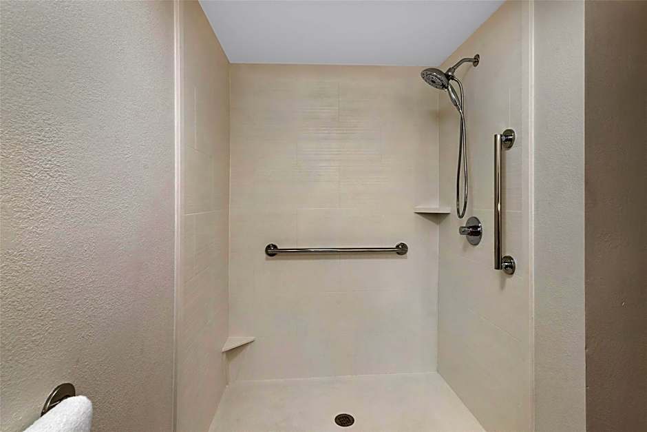 This room features a 32-inch flat-screen cable TV, microwave, and small refrigerator. A desk is also included.